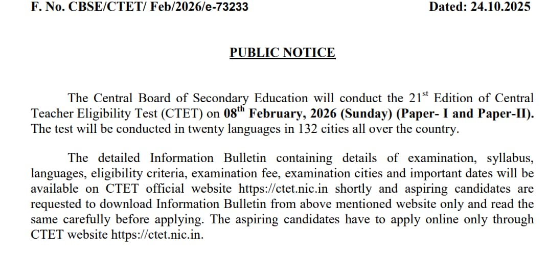 सीटेट परीक्षा तिथि 2026 | 8 फरवरी 2026 |