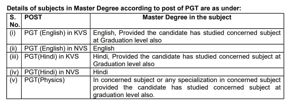 पीजीटी (Hindi, English, Physics, Chemistry, Maths, Biology, History, Geography, Economics, Commerce) | संबंधित विषय में 50% अंकों के साथ मास्टर डिग्री या एनसीईआरटी के रीजनल कॉलेज से दो वर्षीय एकीकृत एमएससी। बीएड अनिवार्य। हिंदी और अंग्रेज़ी दोनों माध्यम में शिक्षण दक्षता। |