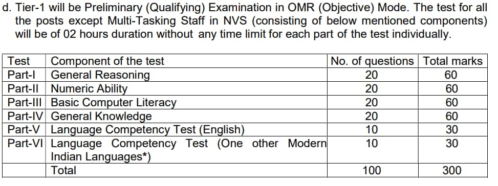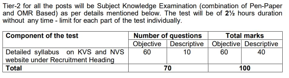 नवोदय विद्यालय समिति (NVS) केंद्रीय विद्यालय संगठन (KVS) भर्ती परीक्षा 2025 मुख्यतः दो चरणों लिखित परीक्षा और प्रोफेशनल कम्पिटेंसी टेस्ट/इंटरव्यू में आयोजित की जाएगी। परीक्षा की अवधि अधिकांश पदों के लिए 180 मिनट होगी, जिसमें कुल 100 प्रश्न पूछे जाएंगे। कुल 300 अंकों की परीक्षा होगी।