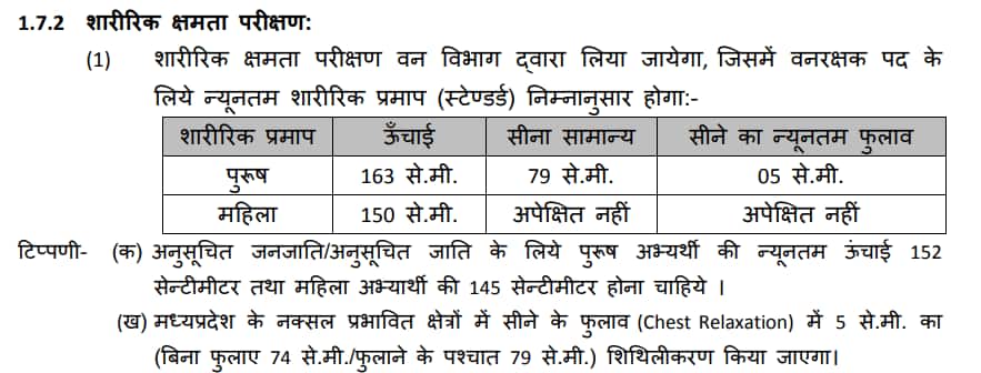 एमपी वन रक्षक/क्षेत्र रक्षक: पुरुष उम्मीदवार की ऊंचाई - 163 सेमी। महिला की ऊंचाई - 150 सेमी। पुरुषों के लिए सीना 79 सेमी (+5 सेमी फुलाव) अनिवार्य है।