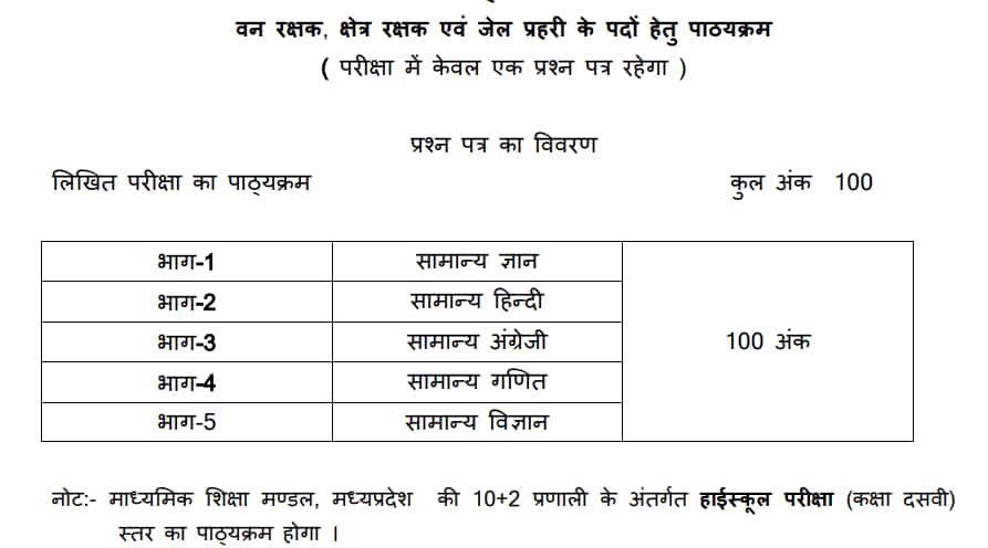 एमपी जेल रक्षक, वन रक्षक परीक्षा 100 अंकों की होगी। परीक्षा अवधि 2 घंटे है। प्रश्न पत्र में पांच खंड सामान्य ज्ञान, सामान्य हिंदी, सामान्य अंग्रेजी, सामान्य गणित और सामान्य विज्ञान होंगे। प्रश्न आमतौर पर हाई स्कूल स्तर के होगे।