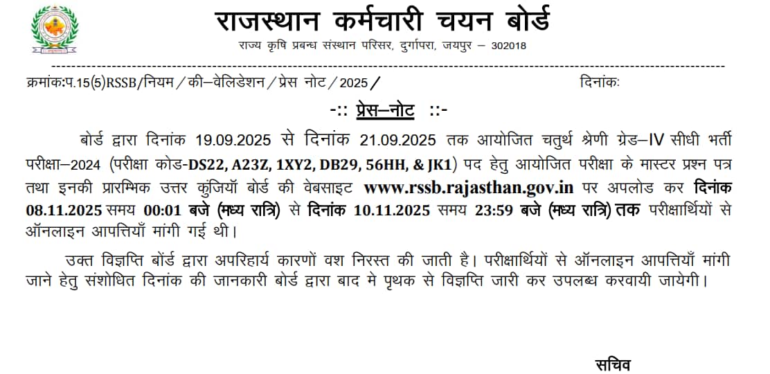 राजस्थान चतुर्थ श्रेणी आंसर की आपत्ति तिथि सूचना देखें:-