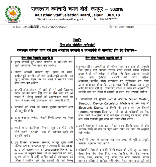 राजस्थान कर्मचारी चयन बोर्ड (आरएसएसबी) द्वारा हर वर्ष विभिन्न विभागों में भर्ती हेतु परीक्षाओं का आयोजन किया जाता है। इन सभी परीक्षाओं के आयोजन में उम्मीदवारों के साथ किसी भी प्रकार की कोई गड़बड़ी/पक्षपात न हो इसलिए बोर्ड द्वारा ड्रेस कोड संबंधित दिशा निर्देश जारी किया जाता है। आरएसएसबी द्वारा आगामी परीक्षाओं के लिए ड्रेस कोड जारी कर दिया गया है। उम्मीदवार आरएसएसबी ड्रेस कोड 2025 अधिसूचना पीडीएफ आधिकारिक वेबसाइट पर जाकर देख सकते हैं। सभी उम्मीदवारों के लिए निर्धारित ड्रेस कोड का पालन करना अनिवार्य है।
