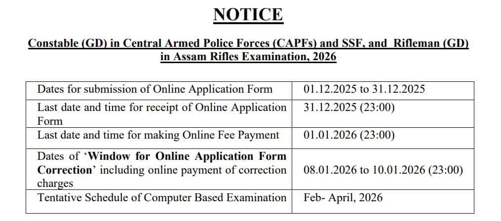 एसएससी जीडी कांस्टेबल अधिसूचना 2026 | 1 दिसंबर 2025 |