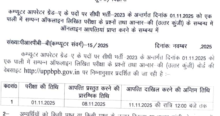 लेटेस्ट: यूपीपीआरपीबी द्वारा यूपी पुलिस कम्यूटर ऑपरेटर ग्रेड-ए एवं पुलिस सहायक उप निरीक्षक (लिपिक) पुलिस सहायक उप निरीक्षक (लेखा) के पदों के लिए हुए परीक्षा के आंसर की पर आपत्ति मांगी गई है। उम्मीदवार 8 से 11 नवंबर 2025 तक आंसर की पर आपत्ति दर्ज करा सकते हैं। यूपी पुलिस कम्यूटर ऑपरेटर ग्रेड-ए एवं पुलिस सहायक उप निरीक्षक (लिपिक) पुलिस सहायक उप निरीक्षक (लेखा) ऑफलाइन लिखित परीक्षा 1 नवंबर 2025 को एक पाली में आयोजित किया गया था।