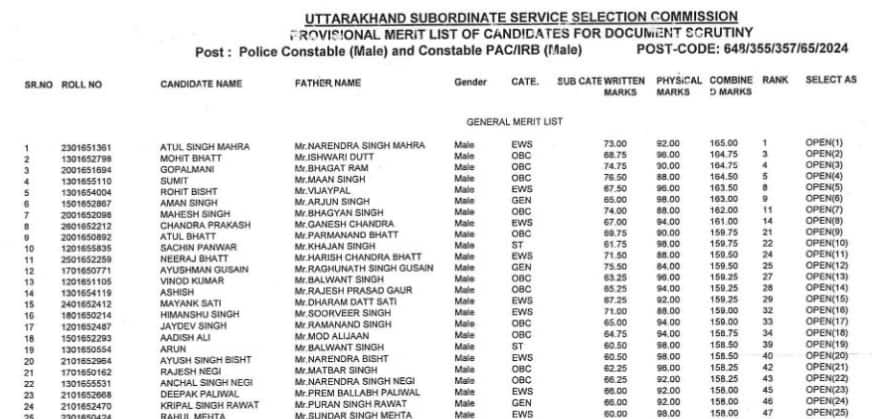 मेरिट लिस्ट में शॉर्टलिस्ट किए गए उम्मीदवारों के रोल नंबर, नाम, पिता के नाम, कैटेगरी, रैंक और मिले हुए मार्क्स शामिल हैं। उम्मीदवार अपने रोल नंबर से सर्च करके अपना उत्तराखंड पुलिस कांस्टेबल रिजल्ट 2025 देख सकते हैं। रिजल्ट डाउनलोड करने के लिए, आधिकारिक पोर्टल पर जाना होगा। यूकेएसएसएससी द्वारा फाइनल आंसर की भी जारी की गई है।