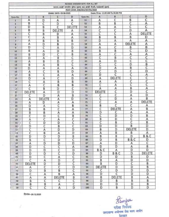 यूकेएसएसएससी की ओर से रिजल्ट जारी होने के साथ ही फाइनल उत्तर कुंजी भी जारी की गई है। मेरिट लिस्ट के सबसे नीचे पेज पर फाइनल उत्तर कुंजी उपलब्ध है। इसके साथ ही आप फाइनल आंसर की नीचे इमेज से भी चेक कर सकते हैं। इससे आप अपने प्रश्न उत्तरों का मिलान कर सकते हैं। ध्यान रखें कि इस पर किसी भी प्रकार से ऑब्जेक्शन दर्ज करने का मौका नहीं दिया जायेगा। उत्तराखंड पुलिस कांस्टेबल फाइनल आंसर की से 16 सवाल हटा दिए गए हैं।